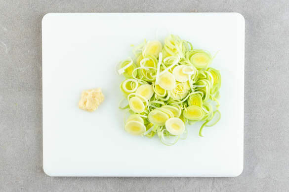 Den Lauch in ca. 0,5cm dicke Ringe schneiden. Den Knoblauch schälen und sehr fein würfeln oder durch eine Knoblauchpresse drücken.