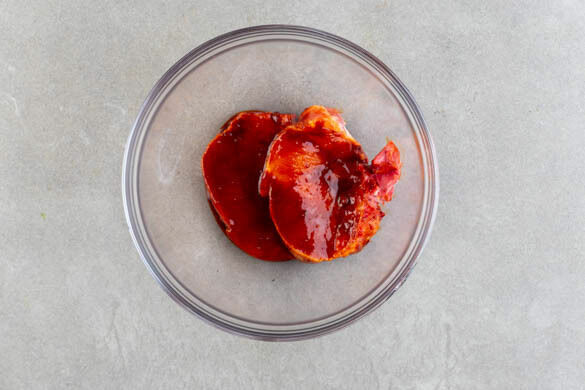 Die ½ der Chilipaste, die Sojasauce und 1 kräftige Prise Pfeffer zu einer Würzsauce verrühren. Das Fleisch trocken tupfen, mit der Würzsauce vermengen und beiseitestellen.