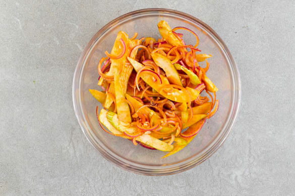 Die Birnen vierteln, entkernen und in dünne Scheiben schneiden. Den Sellerie ebenfalls in dünne Scheiben schneiden. Die Zwiebeln schälen, halbieren und in feine Streifen schneiden. Alles mit dem Dressing vermengen.
