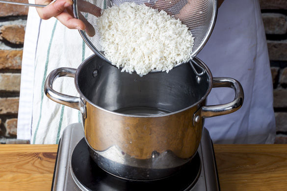 800ml leicht gesalzenes Wasser in einem mittelgroßen Topf zum Kochen bringen. Den Reis in einem Sieb unter fließendem Wasser abspülen, bis das Wasser klar bleibt. Sobald das Wasser kocht, den Reis auf niedrigster Stufe abgedeckt ca. 10–12Min. kochen, bis das Wasser aufgesogen und der Reis bissfest ist. Noch ca. 5Min. ohne Hitzezufuhr abgedeckt ziehen lassen.