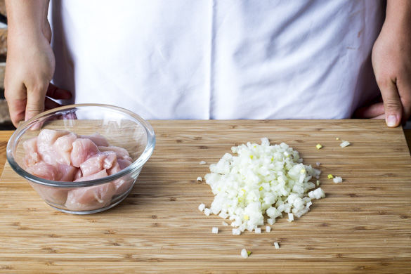 Währenddessen die Hähnchenbrust trocken tupfen und in ca. 1–2cm große Würfel schneiden. Die Zwiebel schälen, halbieren und in feine Würfel schneiden.