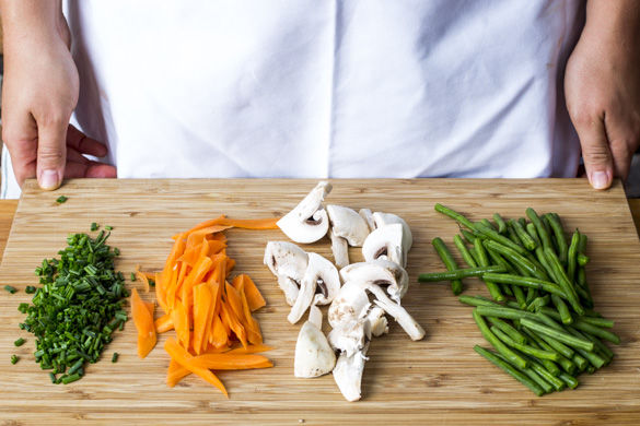 Die Karotten schälen, längs vierteln und in feine Streifen schneiden. Die Pilze ggf. mit etwas Küchenkrepp oder einer Bürste säubern, das Ende des Stiels abschneiden und die Pilze vierteln. Die Bohnen ebenfalls an den Enden abschneiden und ggf. von Fäden befreien, dann halbieren. Den Schnittlauch in feine Röllchen schneiden.