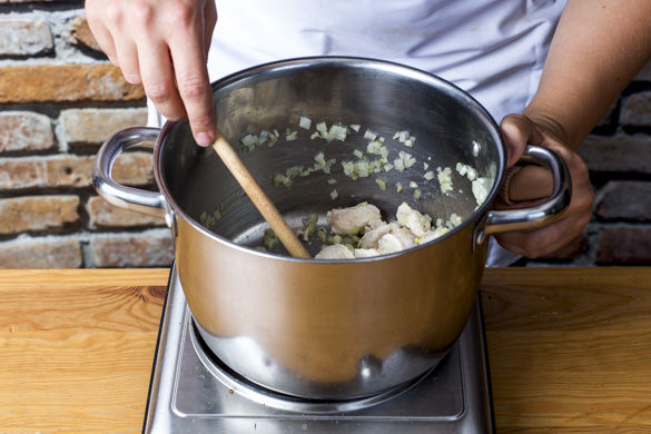 Das Hähnchen mit den Zwiebeln in einem großen Topf mit 1–2EL Olivenöl bei mittlerer Hitze ca. 2–3Min. anbraten, mit Salz und Pfeffer würzen.