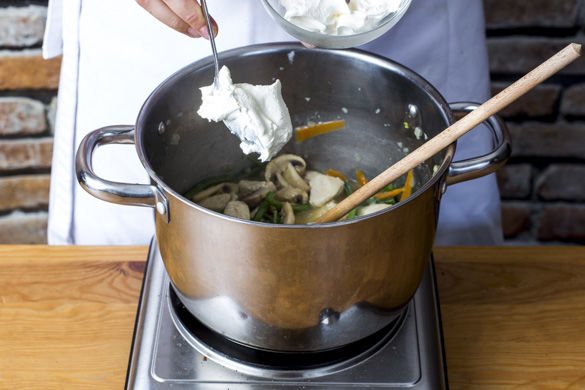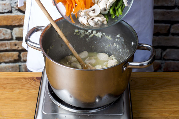 Das Hähnchen mit 1–2EL Mehl bestäuben, den Brühwürfel hinzugeben und mit 400ml Wasser ablöschen. Die Karotten, die Pilze und die Bohnen unterheben. Alles ca. 8–10Min. abgedeckt köcheln lassen, bis das Fleisch und das Gemüse gar sind.