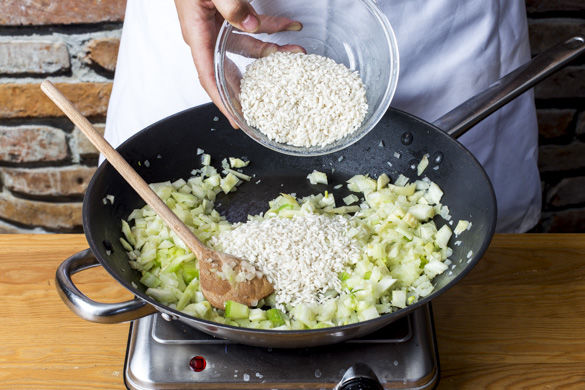 Den Fenchel und die Zwiebeln in einer großen, beschichteten Pfanne mit 1–2EL Olivenöl bei mittlerer Hitze ca. 1–2Min. farblos anschwitzen, dann den Reis unterrühren und ca. 1Min. mitrösten.