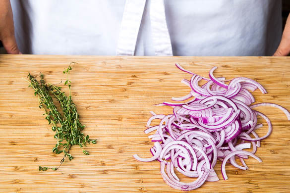 Die Zwiebeln schälen, halbieren und in feine Streifen schneiden. Den Thymian grob von den Stielen streifen.