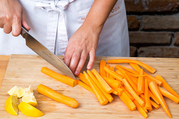 Inzwischen den Ofen auf 200°C Umluft vorheizen. Die Karotten ggf. schälen, der Länge nach halbieren und in ca. 1-2cm dicke, 3-4cm lange Spalten schneiden. Die Schale der Zitrone abreiben, die Hälfte auspressen, eine Hälfte in Spalten schneiden.