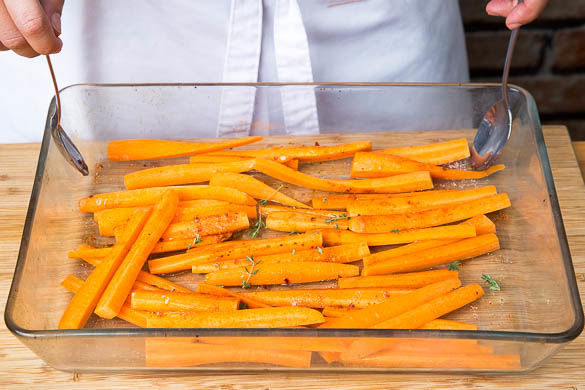 Die Karotten mit 2EL Olivenöl, Honig, Harissa, restlichen Thymian, 1TL Zitronenabrieb, Sesam sowie Salz und Pfeffer mit den Händen gut vermischen und einreiben. In eine Auflaufform oder ein Backblech verteilen und im Ofen ca. 20-25Min. backen, bis die Karotten gar und goldbraun sind.
