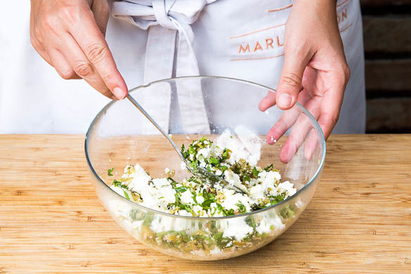 Inzwischen die Oliven grob hacken. Die Minze von den Stängeln zupfen und fein schneiden. Den Käse mit den Händen zerkrümeln. Alles mit 1EL Olivenöl, Pfeffer und 2EL Zitronensaft vermischen.
