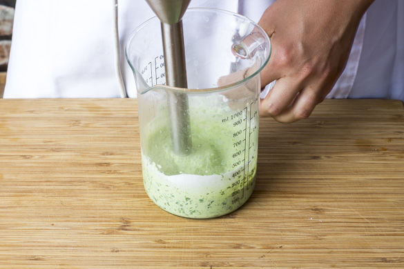 Inzwischen die Kräuter grob hacken, mit der Sauren Sahne mischen und mit einem Stabmixer fein pürieren. Die Sauce mit Salz und Pfeffer abschmecken und als Dip zu dem Pie servieren.