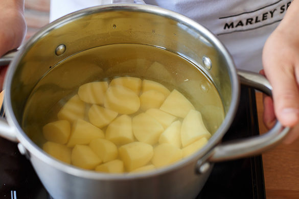 Inzwischen Kartoffeln schälen und in ca. 2cm große Stücke schneiden. Kartoffeln in einen Topf mit ausreichend gesalzenem Wasser geben, zum Kochen bringen und ca. 10Min. leicht köchelnd bissfest garen. Wasser abgießen und leicht abkühlen lassen.
