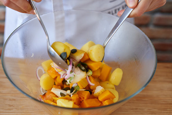 Aus dem Kürbis kann man nicht nur gruselige Gesichter schnitzen, sondern einen echt leckeren Salat zubereiten. Zusammen mit Kartoffeln, Birne und zartem Rindfleisch schmeckt das Herbstgemüse richtig gut. Noch etwas von dem cremigen Dressing über alles träufeln und du kannst loslegen!