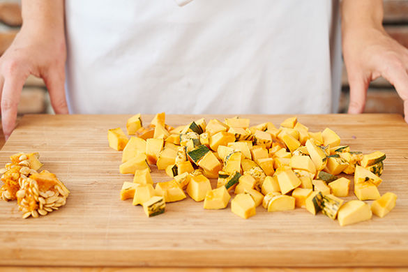 Ofen auf 220°C Umluft vorheizen. Kürbis waschen, halbieren, Kerne entfernen und samt Schale in ca. 2cm große Stücke schneiden. Auf ein Backblech geben, mit etwas Öl besprenkeln und im Ofen ca. 15Min. goldbraun und bissfest garen.