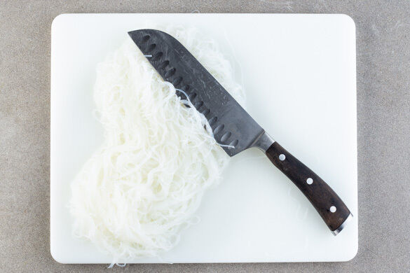 In einem mittelgroßen Topf ausreichend gesalzenes Wasser für die Nudeln zum Kochen bringen. Den Topf vom Herd nehmen, die Nudeln in das heiße Wasser geben und abgedeckt in 3–5Min. gar ziehen lassen. Die Nudeln in ein Sieb abgießen und abtropfen lassen. Tipp: Um die Weiterverarbeitung zu erleichtern, die Nudeln ggf. 1–2 Mal durchschneiden.