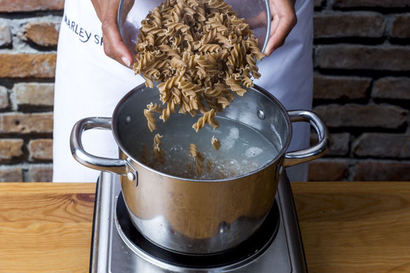 Sobald das Wasser kocht, die Pasta für ca. 10-12Min. bissfest kochen. Etwas Pastawasser auffangen, dann die Nudeln abgießen und kalt abschrecken.