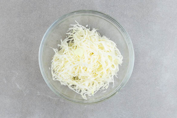 Den Weißkohl mit 1EL Essig sowie je 1 kräftigen Prise Salz und Pfeffer mit den Händen kräftig durchkneten. Beiseitestellen und ziehen lassen.
