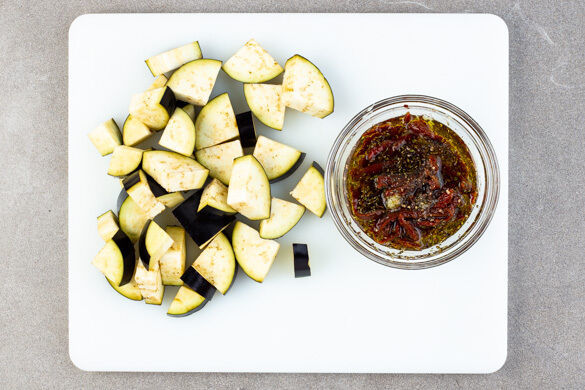 Den Backofen auf 220°C (200°C Umluft) vorheizen. Die Aubergine der Länge nach vierteln, dann quer in ca. 1cm dicke Scheiben schneiden.