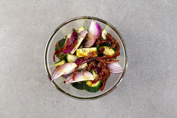 Die Zucchini längs halbieren und quer in dünne Scheiben schneiden. Die Zwiebel schälen und in Spalten schneiden, dann mit der Zucchini und der restlichen Tomatenmischung vermengen.