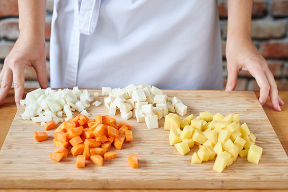 Kartoffeln, Sellerie, Karotten und Zwiebel schälen und in ca. 1cm große Würfel schneiden.