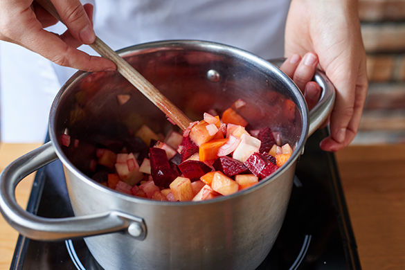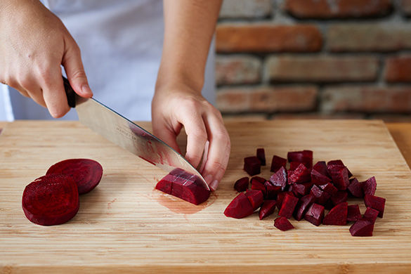 Rote Beete schälen und ebenfalls in ca. 1cm große Würfel schneiden. Da die rote Beete stark abfärbt, alle Utensilien nach Gebrauch gründlich spülen.