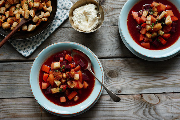Das ist genau das Richtige für kalte Tage! Eine wärmende Rote-Beete-Suppe. Damit auch wirklich alle satt werden, haben wir noch Crostini gebraten. Wer will, nimmt sich noch einen Löffel vom Sahne-Meerrettich.