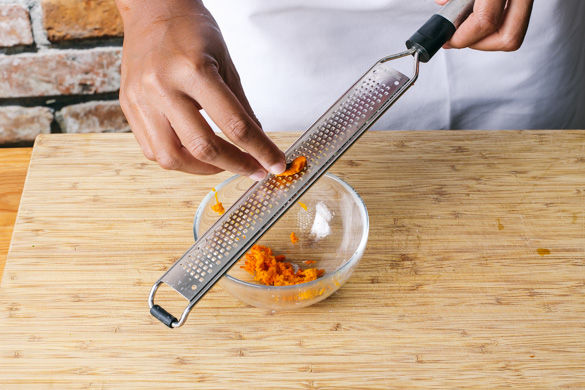 Inzwischen den frischen Kurkuma schälen und fein raspeln. Vorsicht! Da Kurkuma stark färbt, am besten Einmalhandschuhe tragen oder sofort die Hände waschen. Tipp: Kurkuma lässt sich wie Ingwer am besten mit einem Teelöffel schälen.