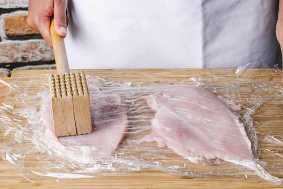 Nun das Hähnchenfilet zwischen zwei Lagen Klarsichtfolie mit einem Fleischklopfer oder einer schweren Pfanne auf ca. 1cm flach klopfen. Das Fleisch von beiden Seiten in der Joghurtsauce marinieren lassen.