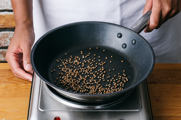 Die Koriandersamen in einer kleinen Pfanne ohne Öl ca. 1-2Min. bei mittlerer Hitze anrösten. Aus der Pfanne nehmen und entweder mit einem Mörser oder der breiten Seite des Messers flach drücken, dann mit geraspelten Kurkuma und der Hälfte des Joghurts zu einer Marinade mischen.