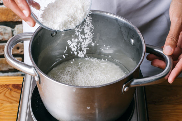 800ml leicht gesalzenes Wasser in einem mittleren Topf zum Kochen bringen. Den Reis in einem Sieb unter fließendem Wasser abspülen, bis das Wasser klar bleibt. Sobald das Wasser kocht, den Reis mit den Kokosraspeln im Topf bei niedrigster Hitze mit einem Deckel ca. 10-12Min. bissfest kochen. Schließlich ca. 5Min. zugedeckt ohne Hitze ziehen lassen.