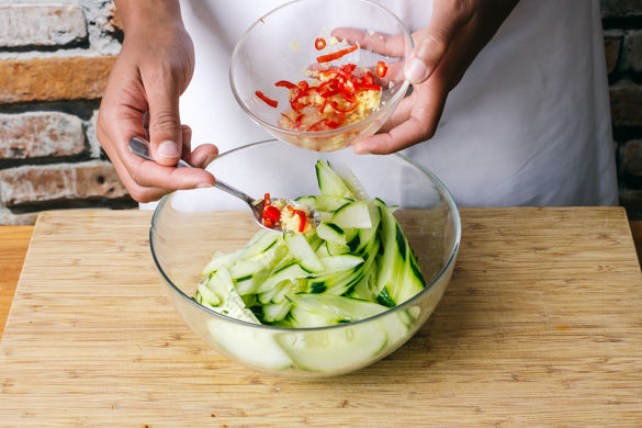 Inzwischen die Gurken schälen, halbieren und schräg in dünne Scheiben schneiden. Die Peperoni längs halbieren, entkernen und kurze Streifen schneiden. Den Ingwer schälen und fein hacken. Die Peperoni mit dem Ingwer mit 2-3EL Essig, eine große Prise Zucker und etwas Salz verrühren, bis sich der Zucker auflöst und unter den Gurkensalat mischen.