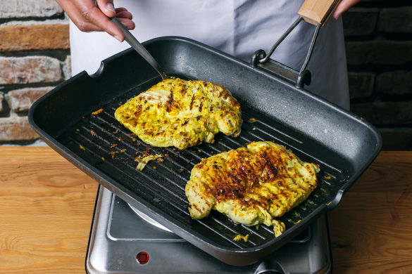 Die Koriandersamen in einer kleinen Pfanne ohne Öl ca. 1-2Min. bei mittlerer Hitze anrösten. Aus der Pfanne nehmen und entweder mit einem Mörser oder der breiten Seite des Messers flach drücken, dann mit geraspelten Kurkuma und der Hälfte des Joghurts zu einer Marinade mischen.