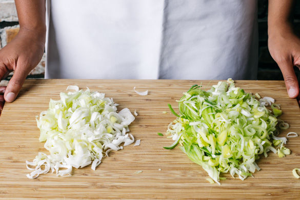 Den Backofen auf 200°C Umluft (220°C Ober-/Unterhitze) vorheizen. Den Lauch längs halbieren, gründlich waschen und den grünen und weißen Teil getrennt in feine Streifen schneiden.