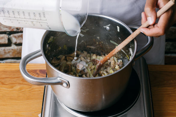 Die Pilze und den restlichen Lauch in einem weiteren mittelgroßen Topf mit 1–2EL Olivenöl bei mittlerer Hitze ca. 2–3Min. anschwitzen. Mit 2EL Mehl bestäuben und mit 50ml Wasser sowie der Milch ablöschen. Den Brühwürfel hinzugeben und alles ca. 5–6Min. köcheln lassen, bis die Sauce eingedickt ist. Mit Salz und Pfeffer abschmecken.