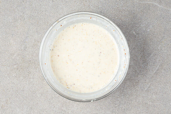 Die Mayonnaise mit dem Senf, 2EL Essig, 4EL Wasser, 1/2TL Zucker und 1 Prise Salz zu einem Dressing verrühren.