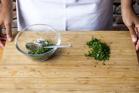 Die Schalotte schälen und fein hacken. Die Petersilie samt Stängeln fein hacken und die Hälfte davon mit Schalotten, je 2EL Essig und Olivenöl sowie Salz und Pfeffer mischen.