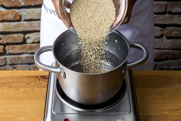 Ca. 1L leicht gesalzenes Wasser für den Quinoa in einem Topf zum Kochen bringen. Den Quinoa in einem feinmaschigen Sieb unter laufendem Wasser waschen, bis das Wasser klar bleibt. Dann in das kochende Wasser geben und ca. 10-12Min. bissfest köcheln lassen, abgießen und den Quinoa gut abtropfen lassen.