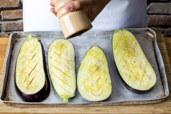 Den Ofen auf 220°C Grill oder 250°C Ober-/Unterhitze vorheizen. Inzwischen die Aubergine längs in vier dicke Scheiben schneiden, mit einem scharfen Messer über Kreuz einschneiden und von beiden Seiten mit etwas Olivenöl und Salz einreiben. Auf einem Backblech ca. 12-15Min. im Ofen grillen, bis die Aubergine gar und goldbraun geröstet ist.