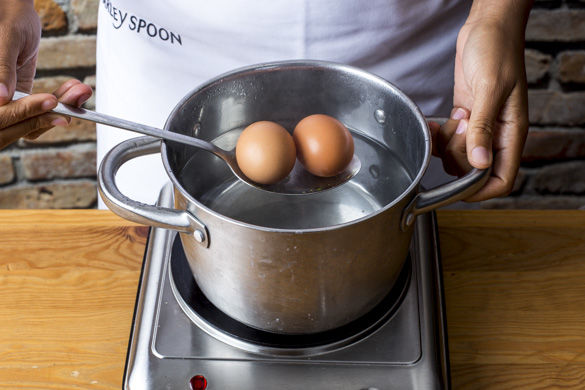 Inzwischen in dem zweiten mittleren Topf ausreichend Wasser für die Eier zum Kochen bringen. Sobald das Wasser kocht, die Eier ca. 5-7Min kochen, dann kalt abschrecken, Eier schälen und halbieren oder vierteln