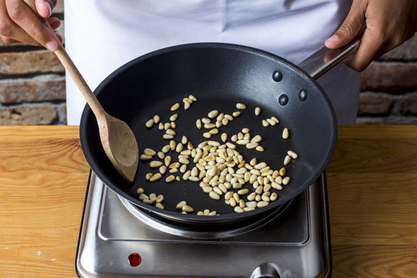 In einer kleinen Pfanne die Pinienkerne bei geringer Hitze goldbaun anrösten. Vorsicht! Die Pinienkerne können schnell anbrennen.