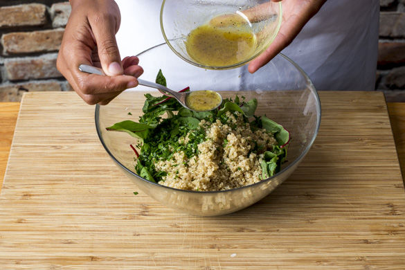 Zum Schluss die restliche Petersilie mit Lucy's Dressing und schwarzen Pfeffer sowie Mangold unter den Quinoa mischen. Den Quinoa mit gegrillten Auberginen sowie Eiern und garniert mit Schalottenalsa und Pinienkernen servieren.
