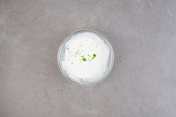 Den Joghurt mit 1/2TL Limettenschale, 1EL Limettensaft sowie je 1 Prise Salz und Pfeffer verrühren. Den Dip bis zum Servieren kühl stellen.