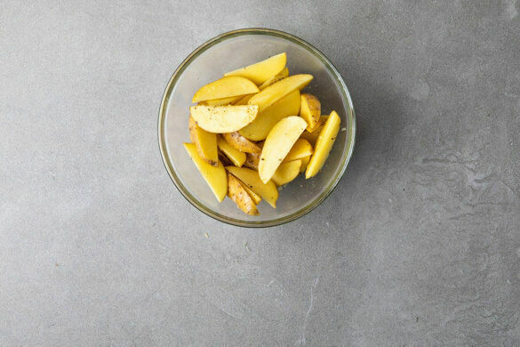 Den Backofen auf 240°C (220°C Umluft) vorheizen. Die Kartoffeln halbieren und jede Hälfte in 2–3cm dicke Spalten schneiden. Mit 2EL Olivenöl sowie je 1 kräftigen Prise Salz und Pfeffer vermengen.