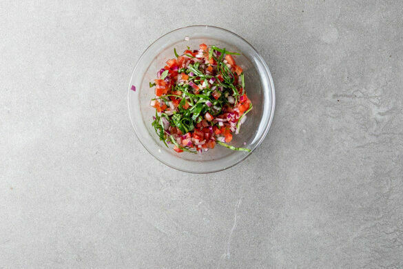 Die Tomaten vierteln, ggf. entkernen und in kleine Würfel schneiden. Die Zwiebel und den Knoblauch schälen und fein würfeln. Das Basilikum samt Stängeln fein schneiden, mit den Tomaten, den Zwiebeln und dem Knoblauch nach Geschmack vermengen und die Salsa mit 1EL Olivenöl, 1–2TL Essig sowie je 1 Prise Zucker, Salz und Pfeffer abschmecken.