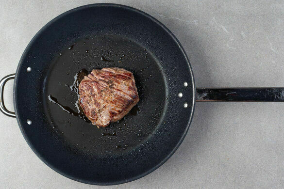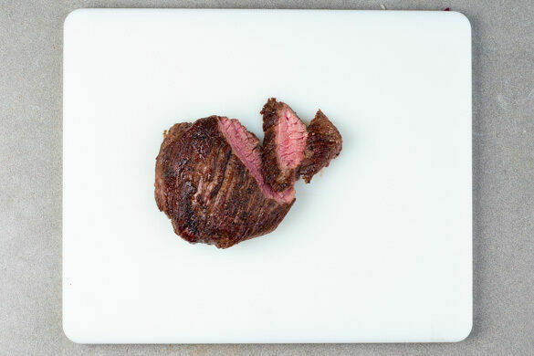 Das Fleisch trocken tupfen, mit Salz und Pfeffer würzen und in einer großen Pfanne mit 2EL Olivenöl bei starker Hitze auf der Fettseite 2–4Min. scharf anbraten. Wenden und weitere 2–4Min. braten, je nach Dicke des Fleisches. Die Hitze reduzieren und das Fleisch 1–3Min. abgedeckt garen, je nachdem, ob es medium oder durch sein soll. Abgedeckt auf einem Teller ruhen lassen.