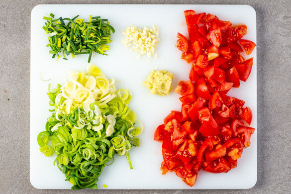 In einem mittelgroßen Topf ausreichend gesalzenes Wasser für die 1/2 der Nudeln zum Kochen bringen. Den Lauch längs halbieren und in feine Streifen schneiden. Etwa 2EL dunkelgrüne Lauchstreifen für die Garnitur beiseitelegen. Den Knoblauch schälen und fein würfeln oder reiben. Die 1/2 des Ingwers oder mehr nach Geschmack fein reiben. Die Tomaten grob würfeln.
