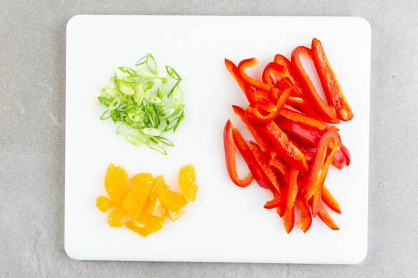Die Paprika vierteln, entkernen und in dünne Streifen schneiden. Die Lauchzwiebeln schräg in feine Ringe schneiden. Die Mandarinen schälen und in kleine Stücke schneiden.