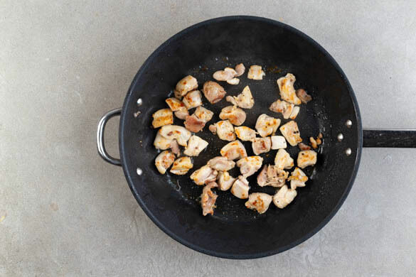 Das Fleisch trocken tupfen, in ca. 2cm große Würfel schneiden und mit Salz und Pfeffer würzen. Das Fleisch in einer großen Pfanne mit 2EL Pflanzenöl bei starker Hitze in 5–6Min. knusprig braten.
