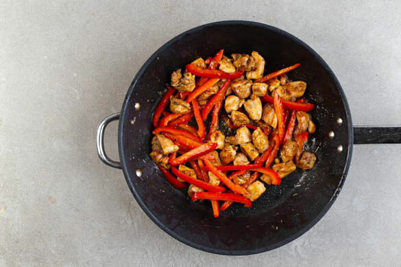 Die Hoisinsauce und 4EL Wasser zufügen und ca. 1Min. unterheben, bis die Paprika und das Fleisch mit der Sauce überzogen sind.
