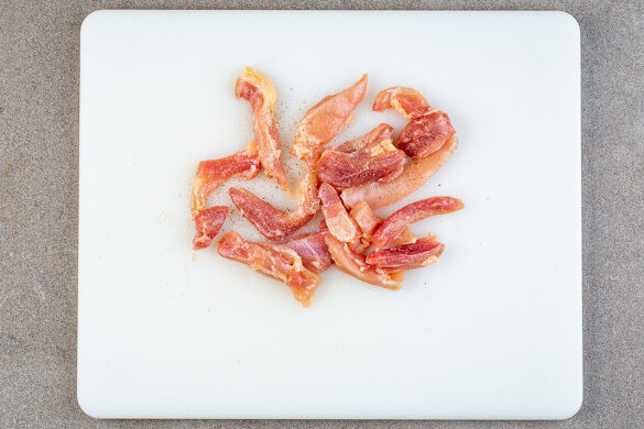 Das Fleisch trocken tupfen und in 1–2cm dicke Schnetzel schneiden, dann mit je 1 kräftigen Prise Salz und Pfeffer würzen.