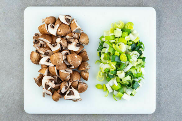 In einem großen Topf ausreichend gesalzenes Wasser für die Pasta zum Kochen bringen. Die Pilze ggf. säubern und je nach Größe vierteln oder sechsteln. Den Lauch längs halbieren und quer in ca. 1cm breite Streifen schneiden.